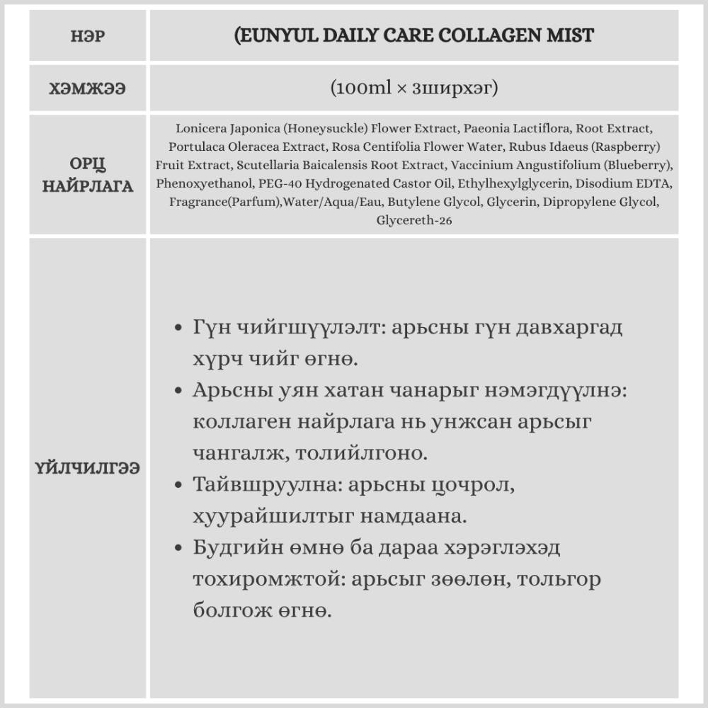 Eunyul Collagen Mist – Арьсаа сэргээж, чийгшүүлэх өдөр тутмын арчилгаа. Арьсыг чийгшүүлж, уян хатан болгож өгдөг Eunyul Daily Care Collagen Mist нь коллаген болон ургамлын гаралтай чийгшүүлэгч найрлагатай. Өдөр бүр арьсны хуурайшилтыг намдааж, сэргээн тэнцвэржүүлнэ.