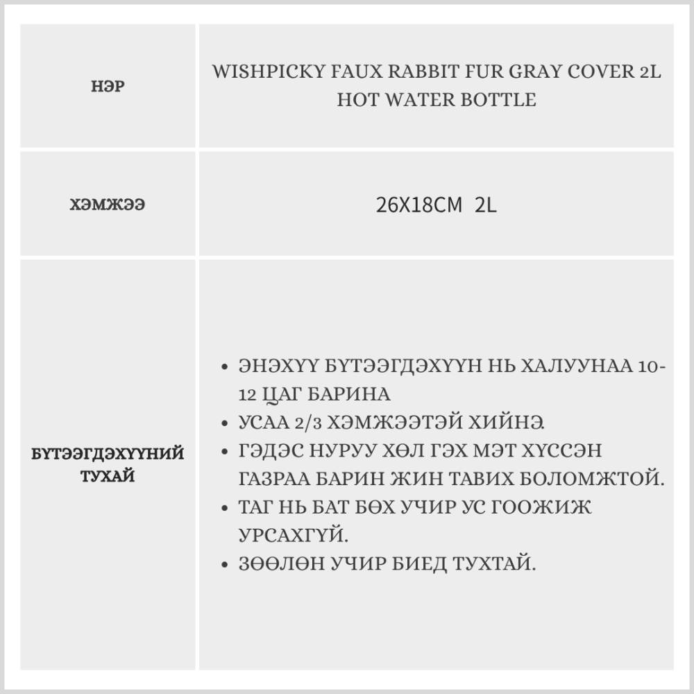 Wishpicky Faux Rabbit Fur Gray Cover 2L Hot Water Bottle /Халуун жин/
