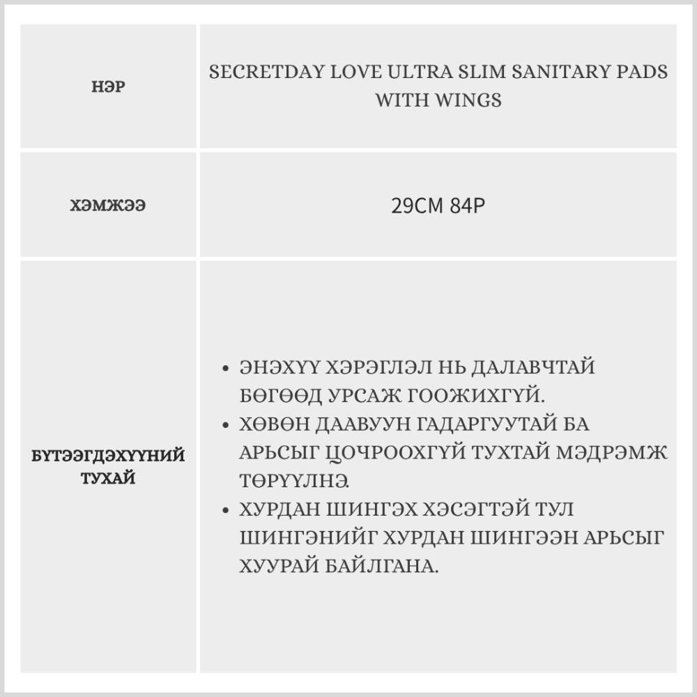 Secretday Love Ultra Slim Sanitary Pads with Wings /Ариун цэврийн хэрэглэл/