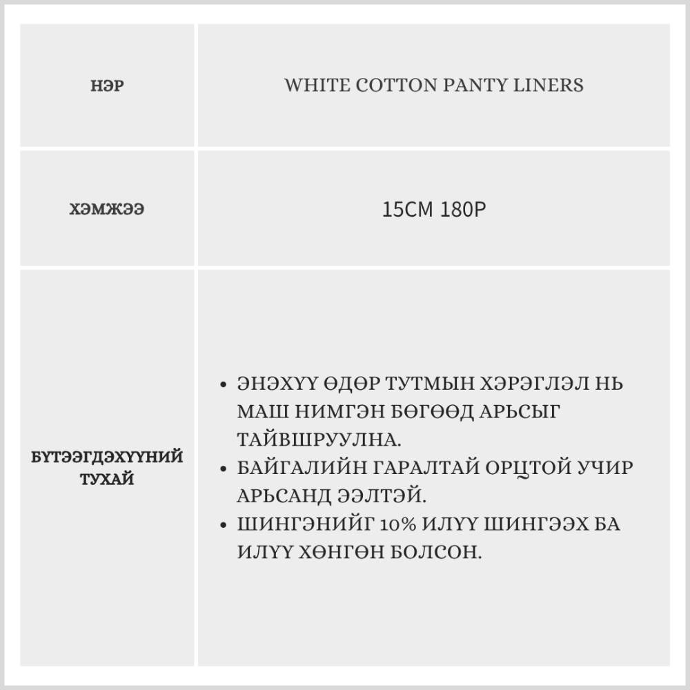 Уг өдөр тутам нь 100% зөөлөн хөвөн даавуун бөгөөд 2 давхаргатай учир шингээлт сайн ба арьсыг тайвшруулна.