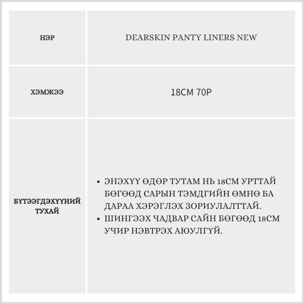 Энэхүү өдөр тутам нь цэвэрхэн тав тухтай байх дуртай хүмүүст зориулсан бөгөөд сарын тэмдэг дуусах үеэр хэрэглэвэл тохиромжтой ба 18см урт учир нэвтрэхгүй.