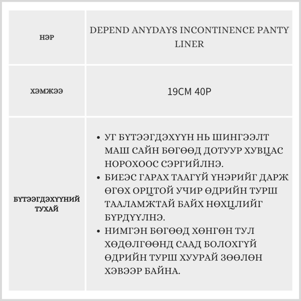 Depend Anydays Incontinence Panty Liner /Өдөр тутам/