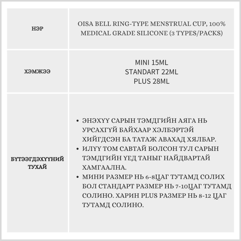 OISA Bell Ring-Type Menstrual Cup, 100% Medical Grade Silicone (3 Types/Packs) /Сарын тэмдгийн аяга/