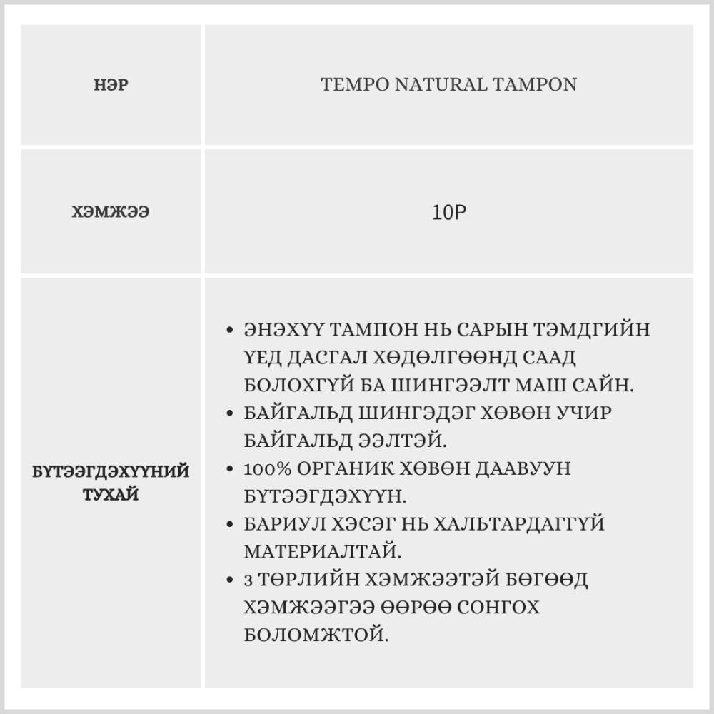 Энэхүү тампон нь 3 төрлийн хэмжээтэй ба хэмжээгээ сонгох боломжтой. Шингээлт сайн ба хөвөн даавуун биед харшлахгүй.