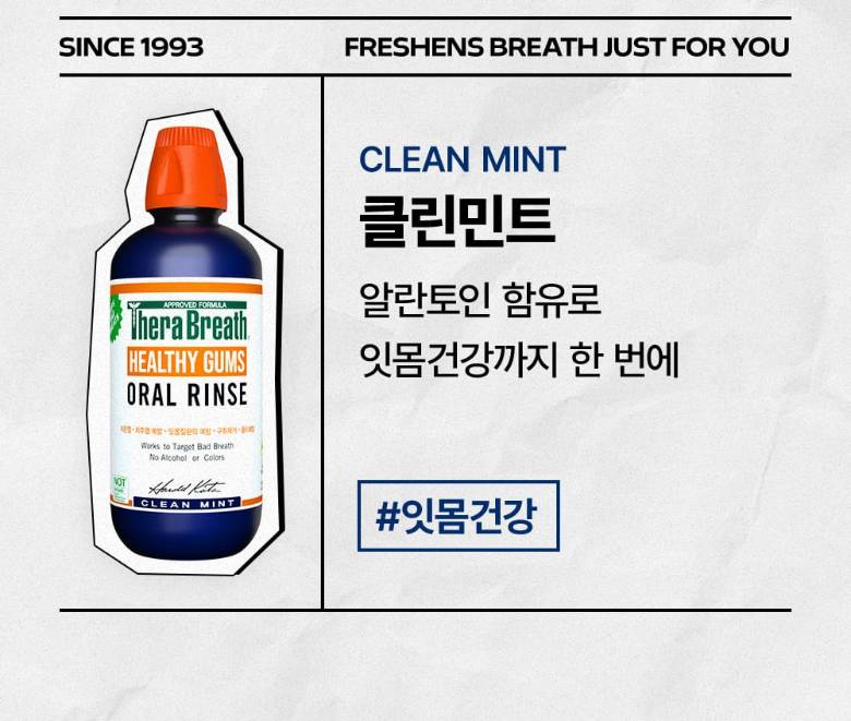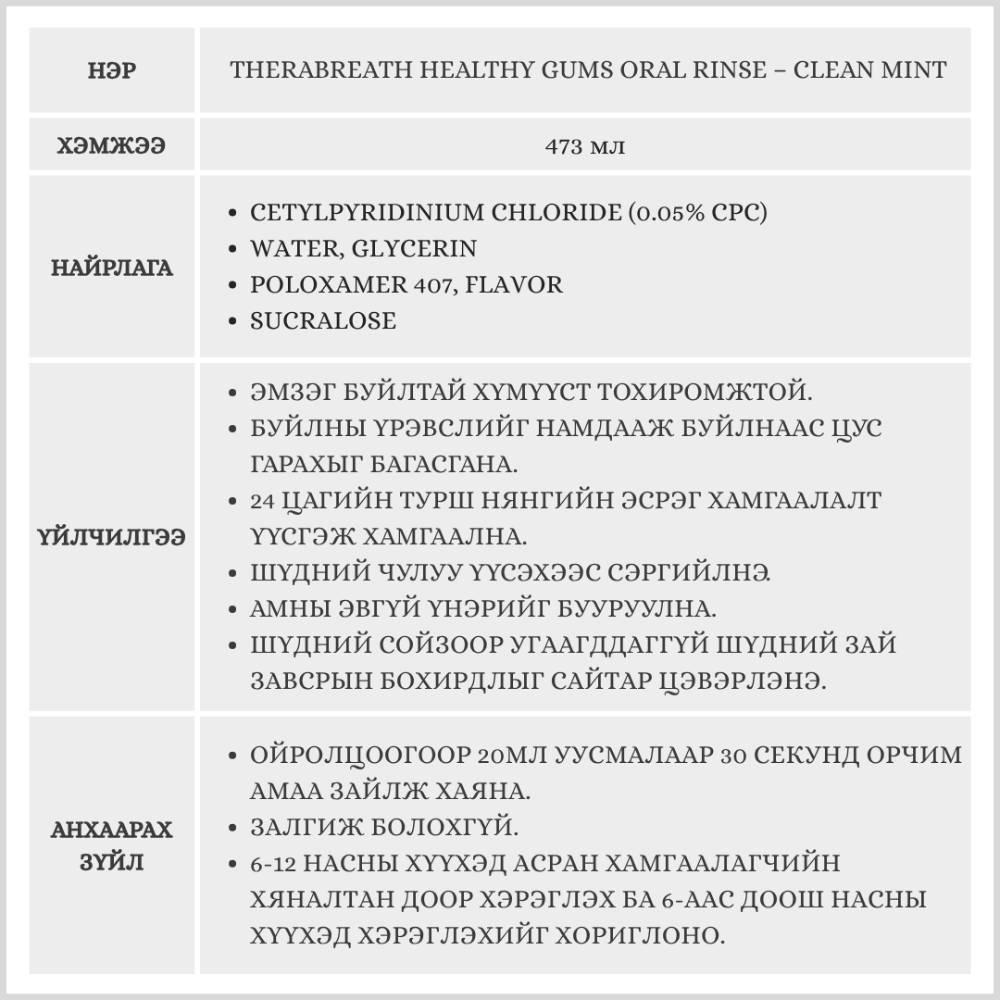 TheraBreath Healthy Gums Clean Mint нь буйлны эрүүл мэндийг дэмжих өндөр үр дүнтэй ам зайлагч бөгөөд үрэвсэл, цус алдалт, шүдний чулуу үүсэхээс сэргийлэхэд тусална. Спирт агуулаагүй тул цочрол өгөхгүй, өдөр тутмын хэрэглээнд тохиромжтой.