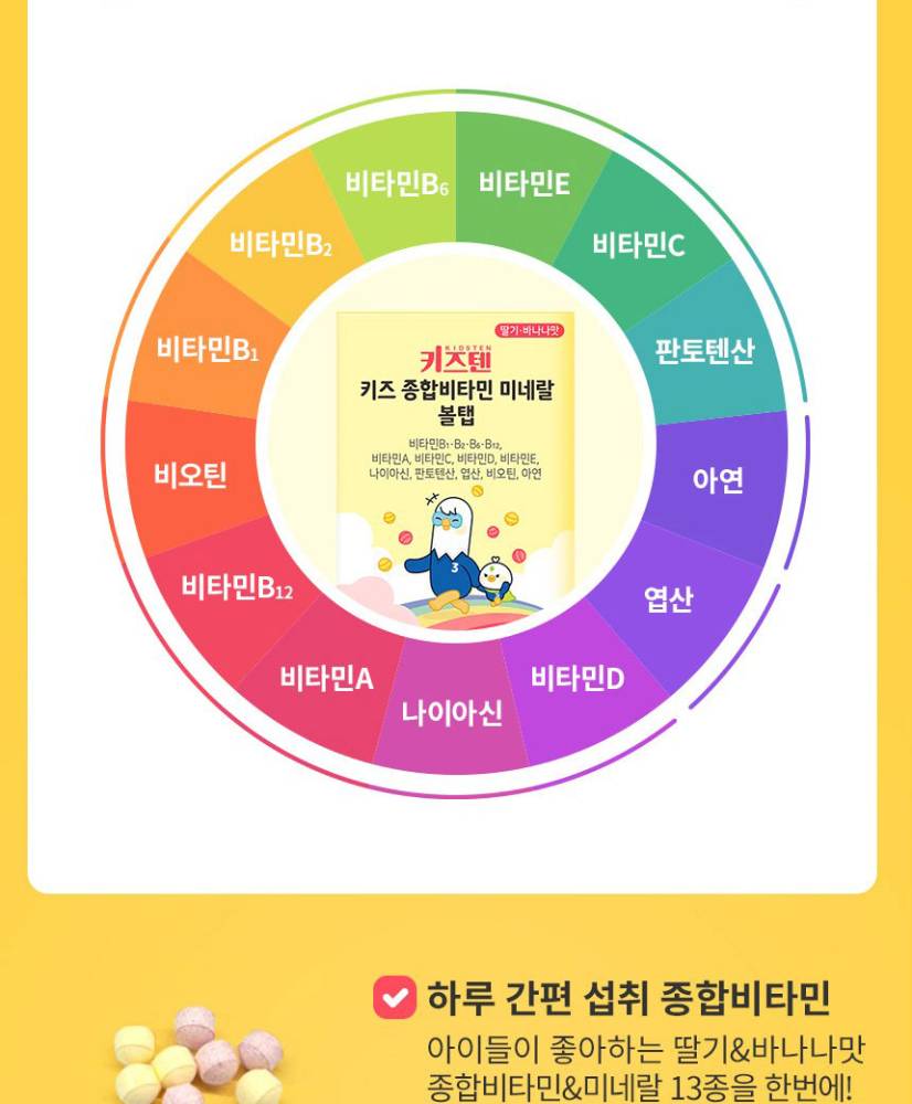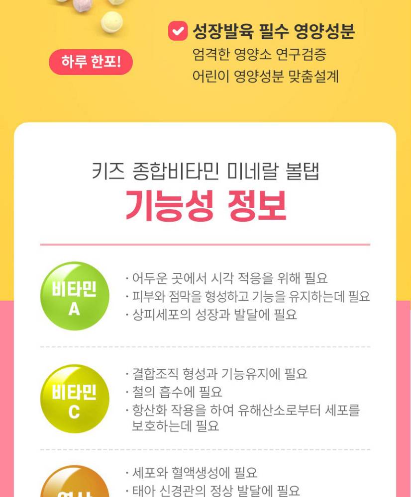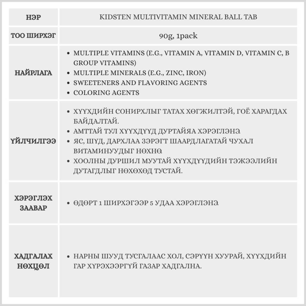 Хүүхдийн өсөлт хөгжилт болон дархлааг дэмжих зориулалттай, бөмбөлөг хэлбэрийн витамин юм.Олон төрлийн витамин, эрдэс бодисыг агуулсан бөгөөд хүүхдэд хэрэглэхэд хялбар, сонирхолтой хэлбэртэй тул хоолны дуршил муу хүүхдүүдийн тэжээлийн дутагдлыг нөхөхөд тустай.