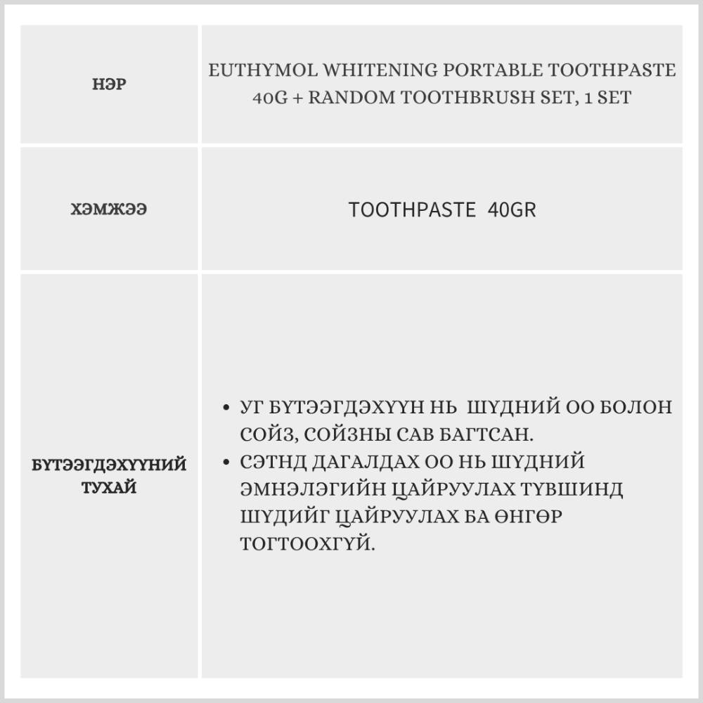 Euthymol Whitening Portable Toothpaste 40g + Random Toothbrush Set, 1 Set /Аян замын сэт/