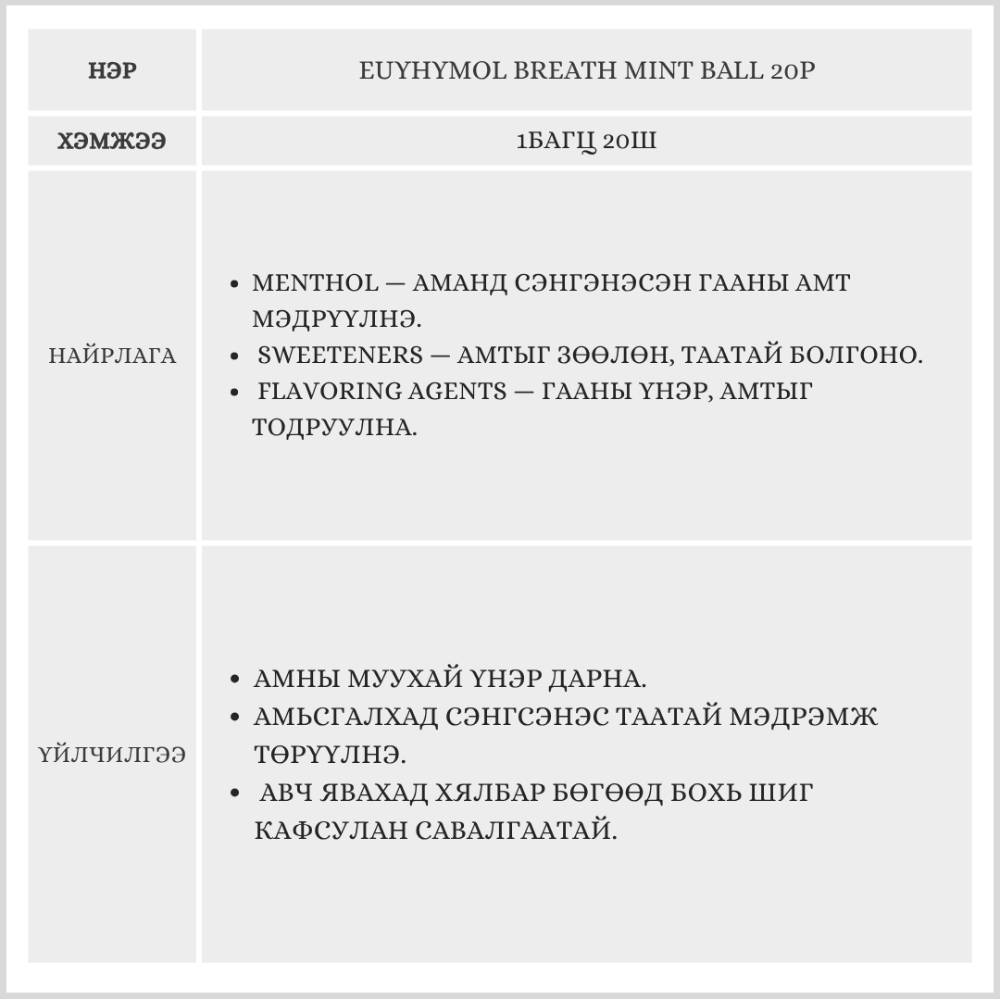 EUTHYMOL BREATH MINT BALL 20P /АМНЫ ҮНЭР ДАРАГЧ/