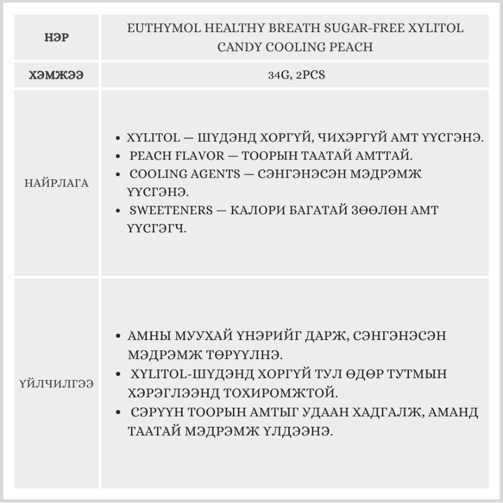 EUTHYMOL HEALTHY BREATH SUGAR-FREE XYLITOL CANDY COOLING PEACH, 34G, 2PCS /АМНЫ ҮНЭР ДАРАГЧ/