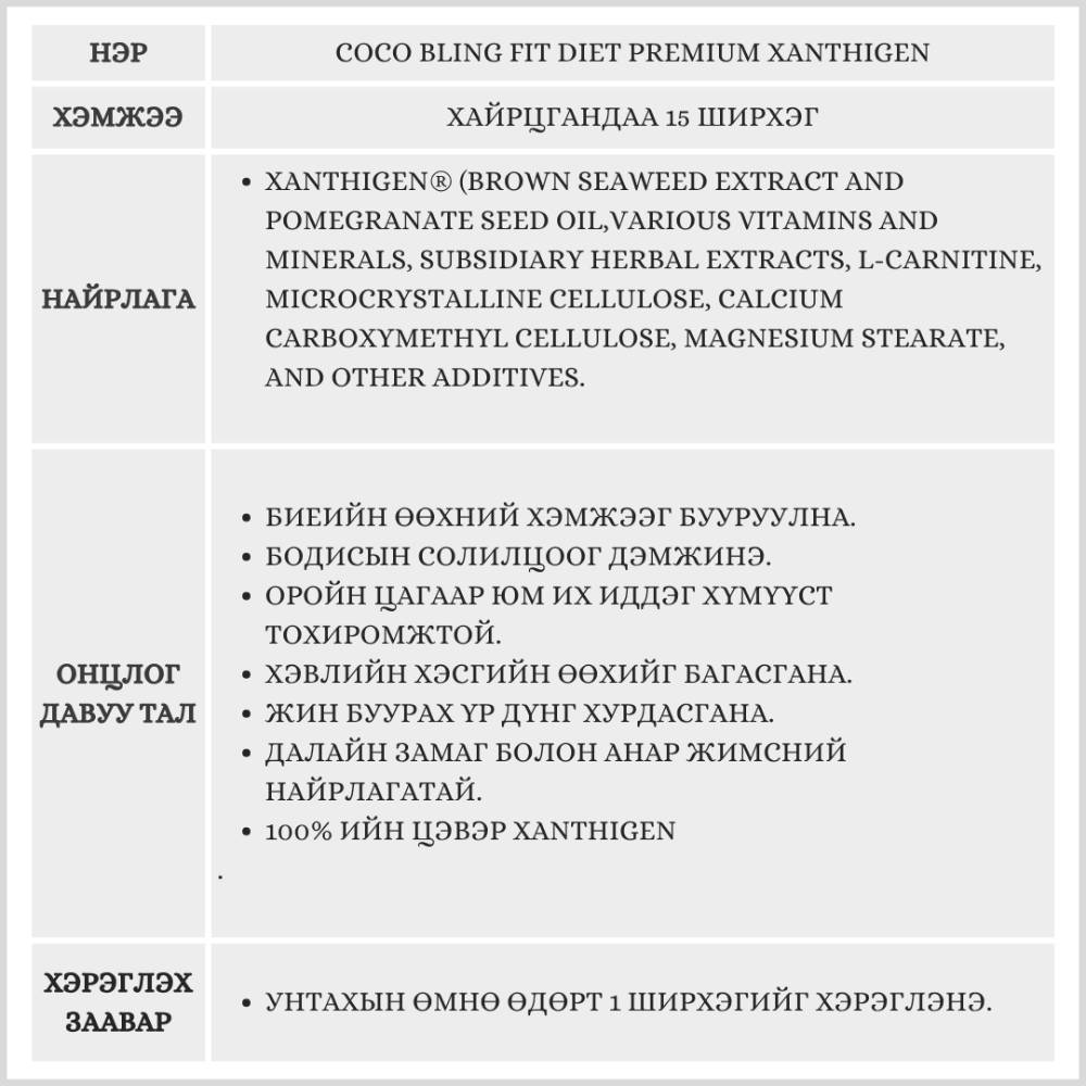 COCO BLING FIT DIET PREMIUM XANTHIGEN/ ЖИН ХАСАХ БҮТЭЭГДЭХҮҮН /
