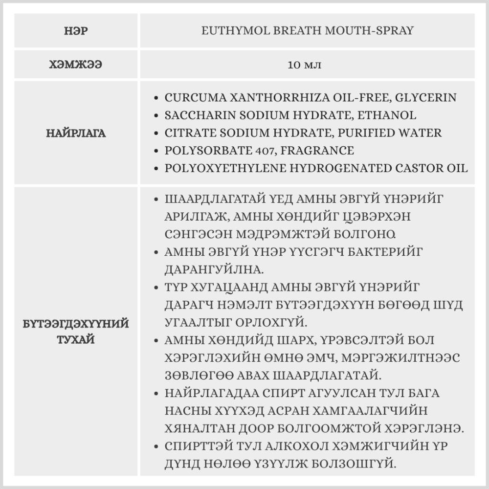 Euthymol Breath Mouth-Spray, 10ml /Амны үнэр дарагч цацлага/