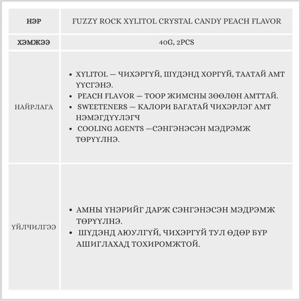 FUZZY ROCK XYLITOL CRYSTAL CANDY PEACH FLAVOR, 40G, 2PCS /АМНЫ ҮНЭР ДАРАГЧ/