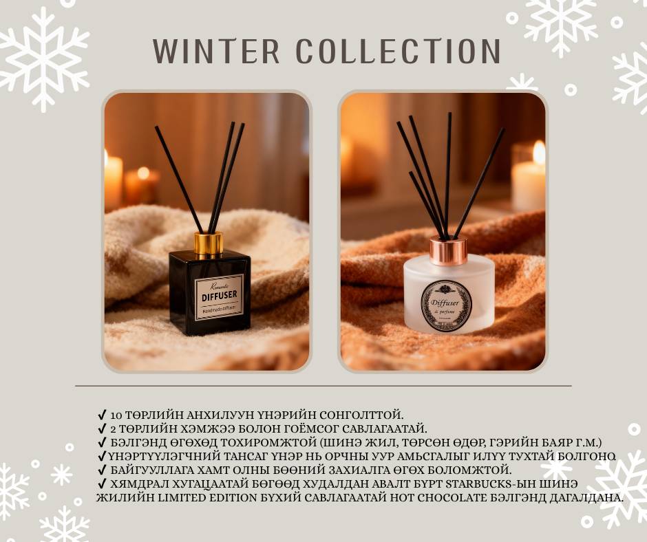 ❄️ The Winter Collection 2025 10 төрлийн анхилуун үнэртэй үнэртүүлэгч + 🍫 Starbucks Hot Cocoa бэлгэнд аваарай. Өвлийн дулаахан мэдрэмж, тайвшрал, тансаг үнэрийг нэг дор багтаасан энэхүү цуглуулга нь танд тав тухтай тансаг дулаан орчинг бий болгоно.