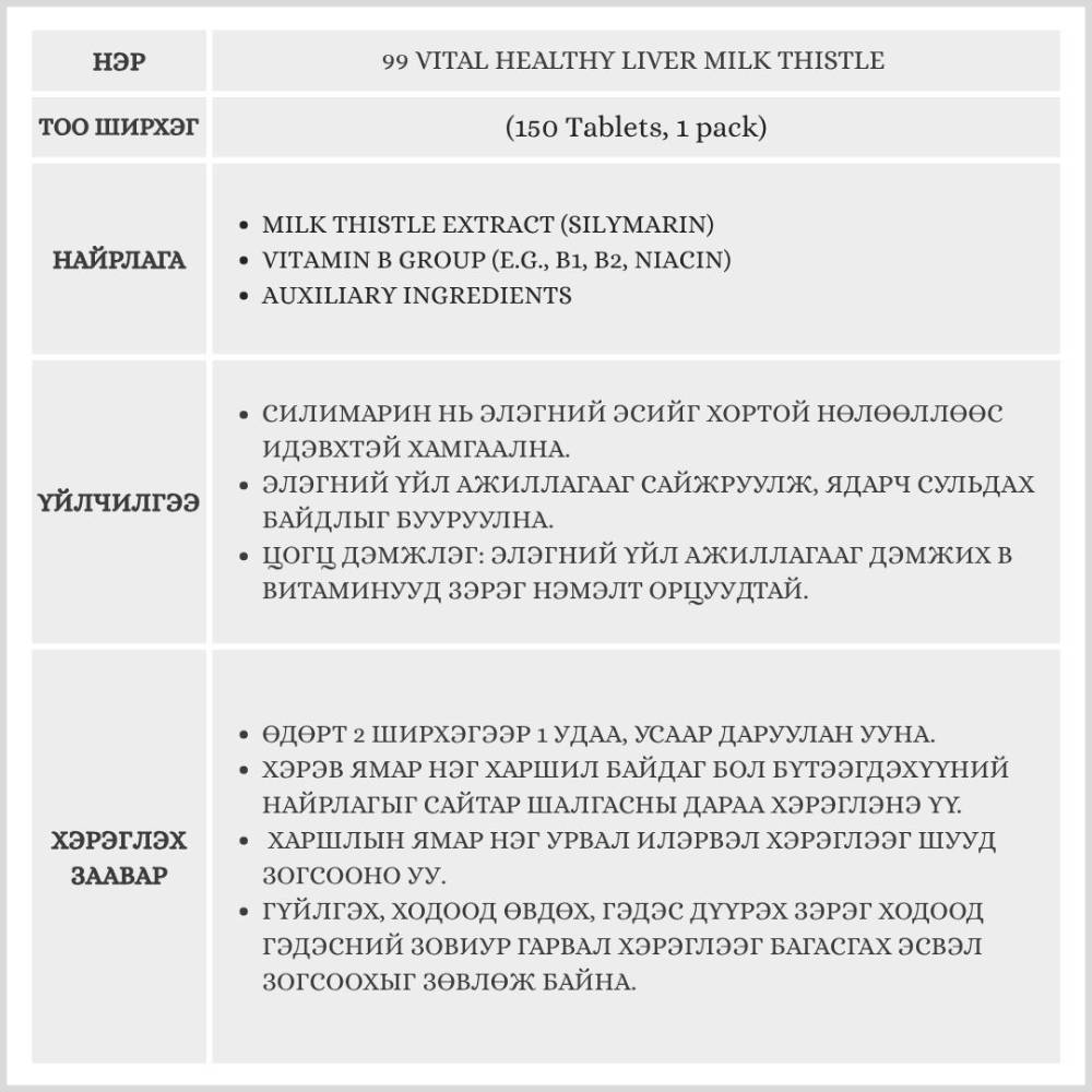 99 Vital Healthy Liver Milk Thistle 150 Tablets, 1pack(Элэгний эрүүл мэндийн бүтээгдэхүүн)