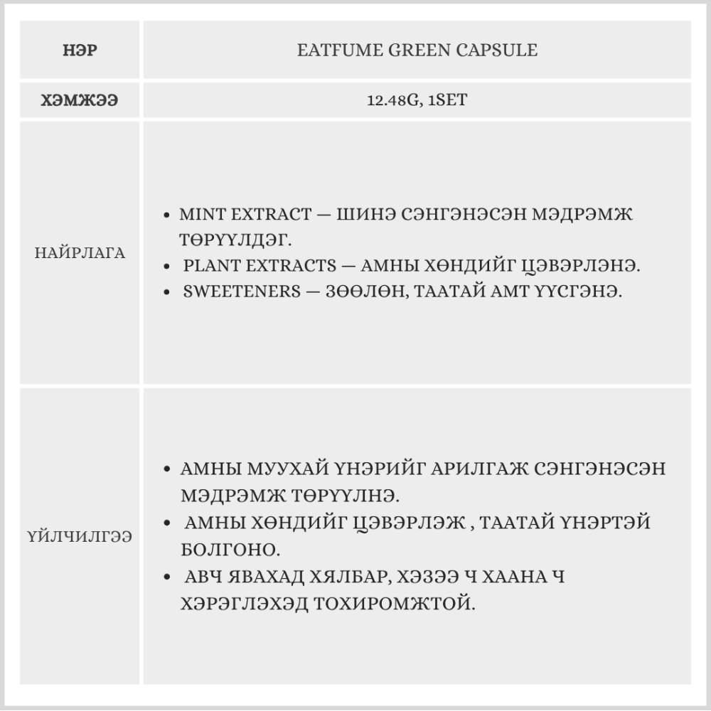 EATFUME GREEN CAPSULE, 12.48G, 1SET /АМНЫ ҮНЭР ДАРАГЧ/
