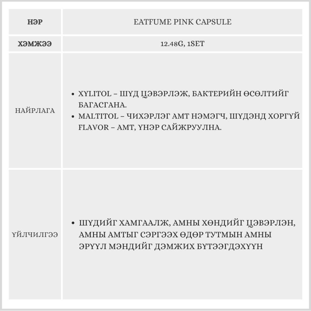 EATFUME PINK CAPSULE, 12.48G, 1SET /АМНЫ ҮНЭР ДАРАГЧ/
