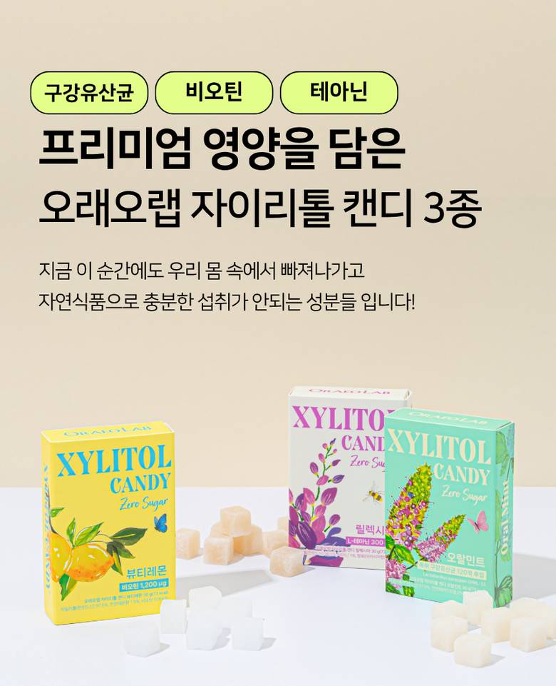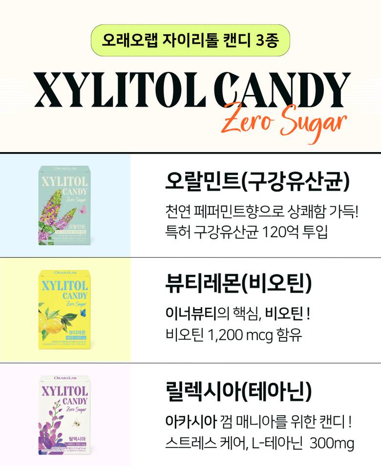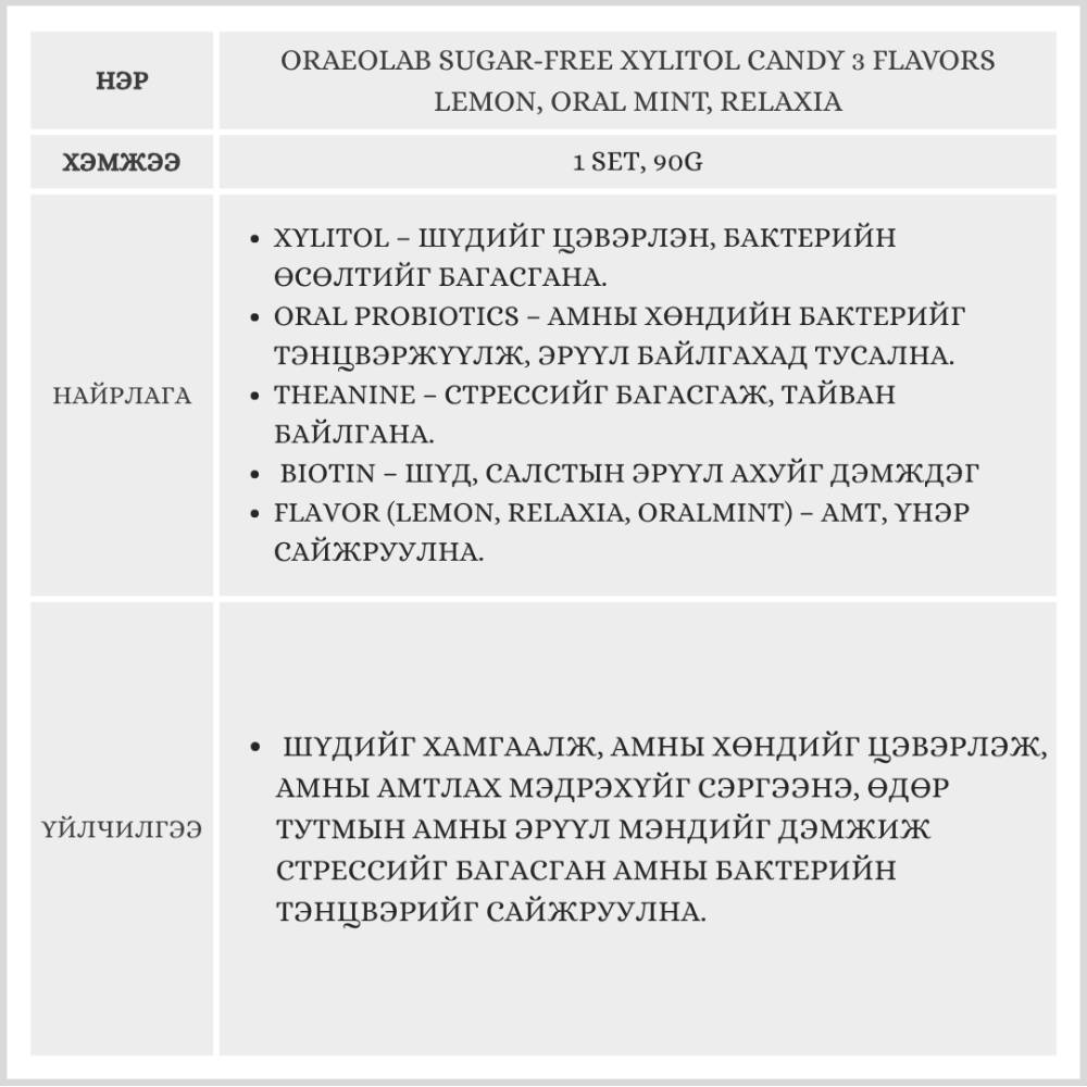 ORAEOLAB SUGAR-FREE XYLITOL CANDY 3 FLAVORS LEMON, PEPPERMINT, 1 SET, 90G /АМНЫ ҮНЭР ДАРАГЧ/
