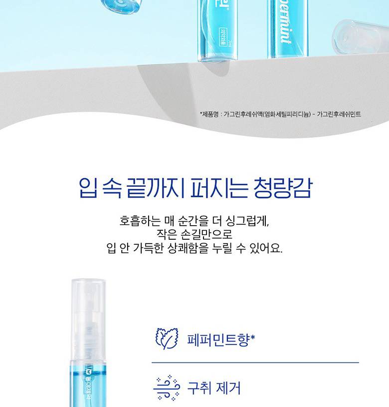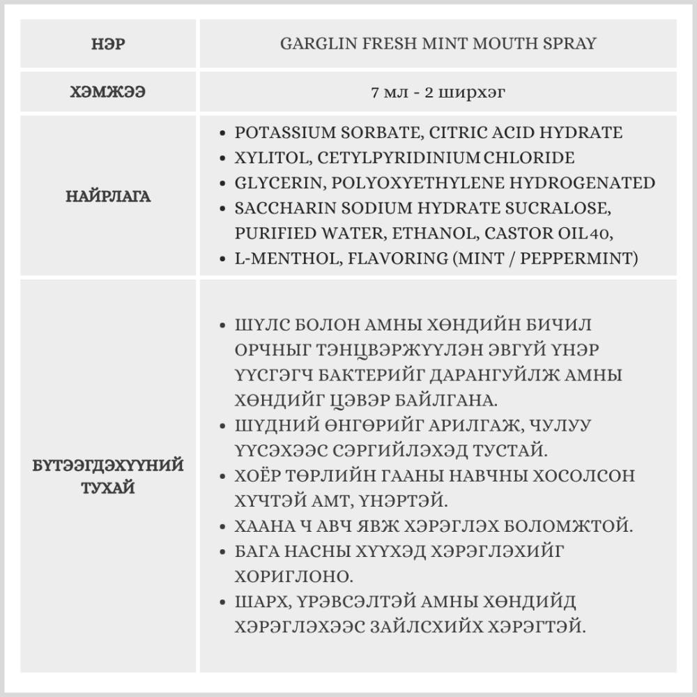 Garglin Fresh Mint Mouth Spray гааны хүчтэй үнэртэй амны үнэр дарагч цацлага нь CPC идэвхит бодист суурилсан ба амны хөндийг хурдан цэвэрлэж, үнэрийг дарна. Ялангуяа гадуур явахад мөн уулзалтын өмнө эсвэл хоолны дараа хэрэглэж болох хялбар хэрэглээтэй.