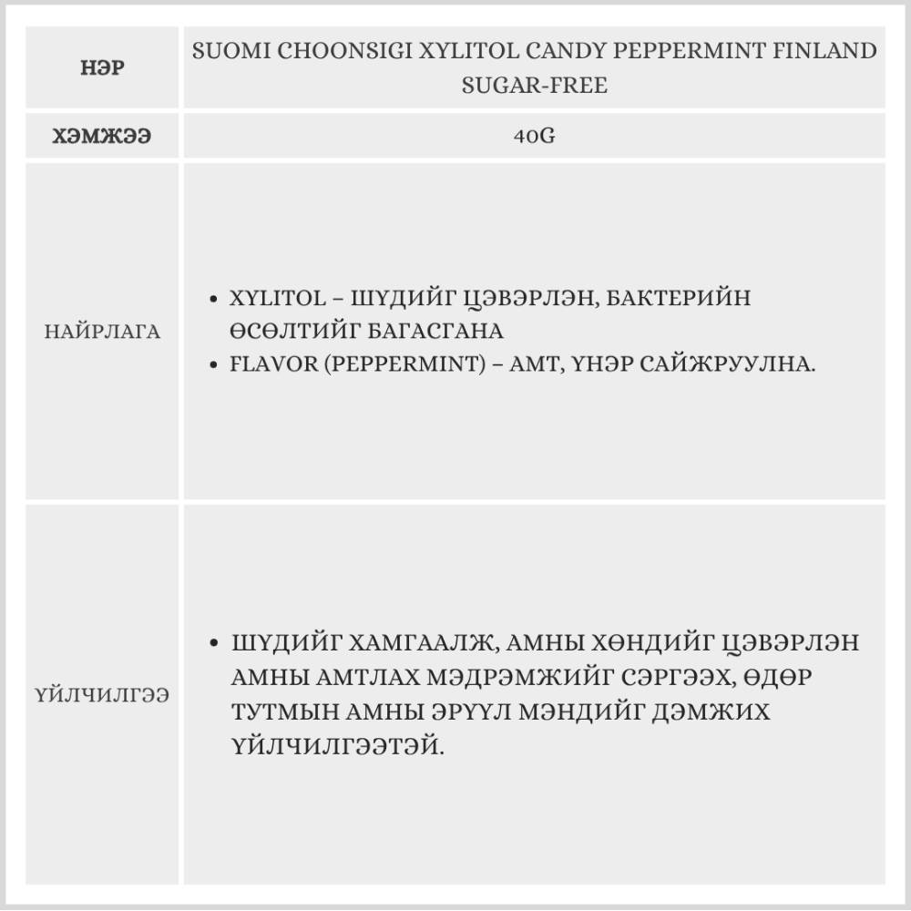 SUOMI CHOONSIGI XYLITOL CANDY PEPPERMINT FINLAND SUGAR-FREE, 40G /АМНЫ ҮНЭР ДАРАГЧ/