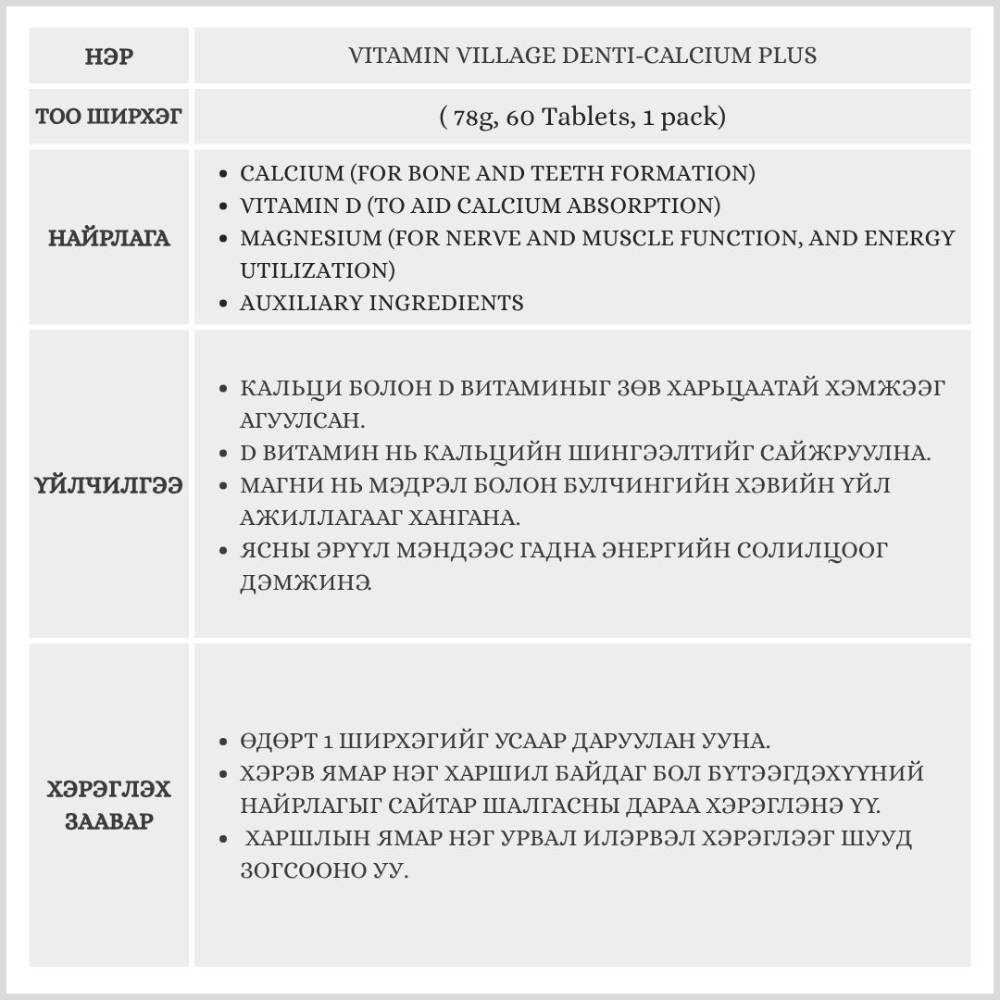 Vitamin Village Denti-Calcium Plus 78g, 60 Tablets, 1 pack(Калци/Магни/Цайр)