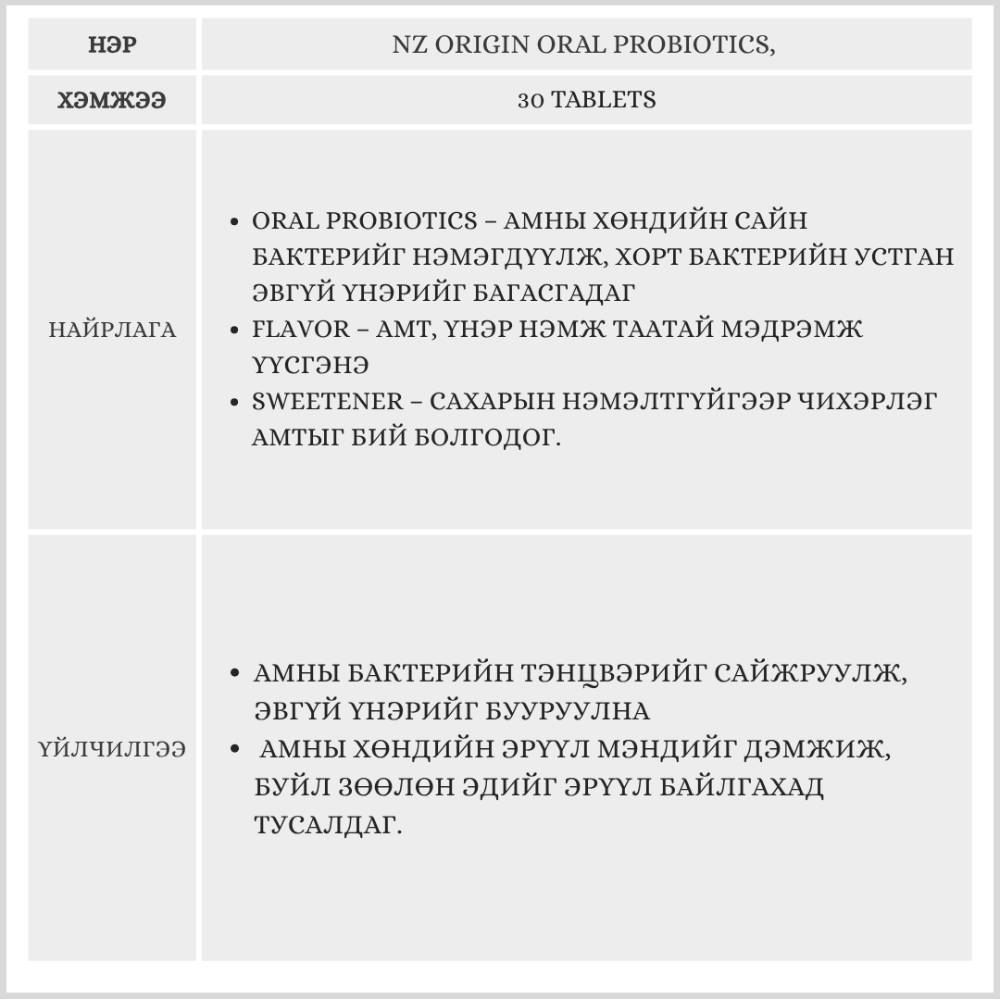NZ ORIGIN ORAL PROBIOTICS, 21G, 30 TABLETS/Амны хөндийн пробиотик/