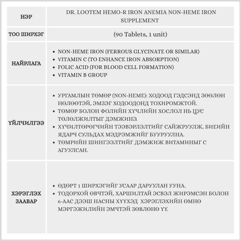 Dr. Lootem Hemo-R Iron Anemia Non-Heme Iron Supplement 90 Tablets, 1 unit(Төмөр / Фолийн хүчил)
