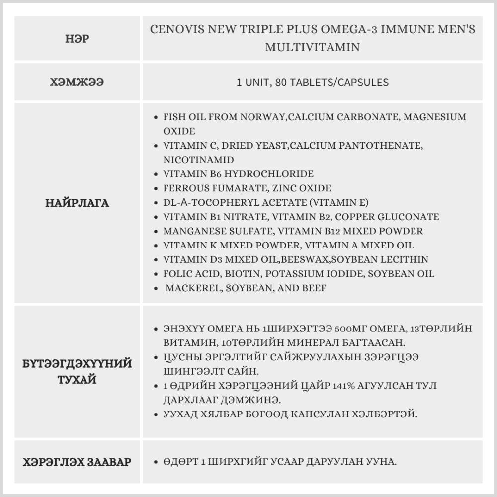Энэхүү бүтээгдэхүүн нь эрэгтэйчүүдэд зориулсан ба хайрцагтаа 80ширхэгтэй. 13төрлийн витамин 10төрлийн минералыг агуулсан дархлаа дэмжих омега.