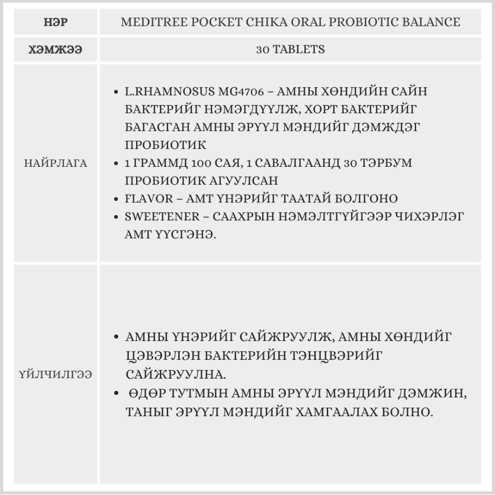 MEDITREE POCKET CHIKA ORAL PROBIOTIC BALANCE, 30 TABLETS /Амны хөндийн пробиотик/