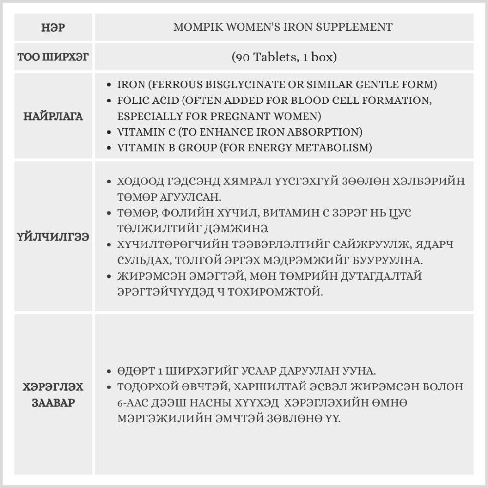 Mompik Women's Iron Supplement 90 Tablets, 1 box(Төмөр / Фолийн хүчил)