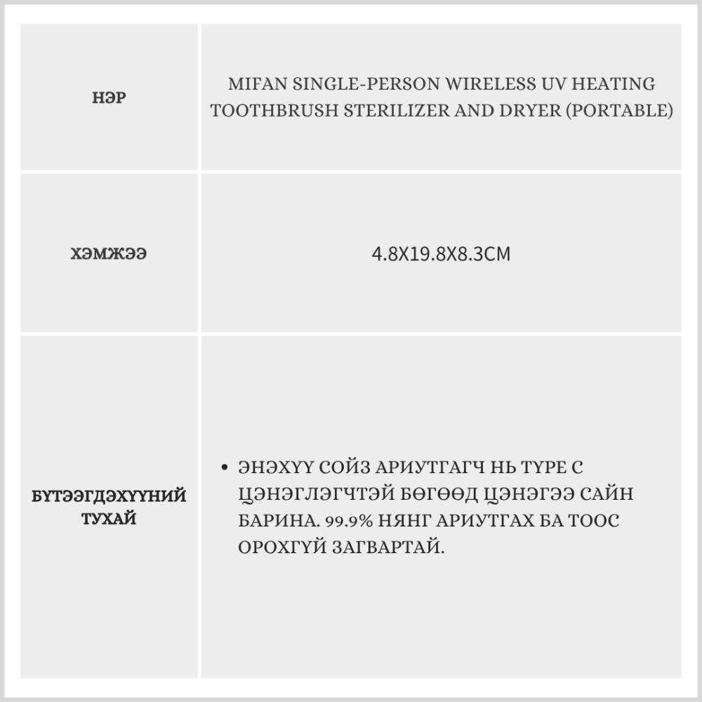MIFAN Single-Person Wireless UV Heating Toothbrush Sterilizer and Dryer (Portable) /Сойз ариутгагч/