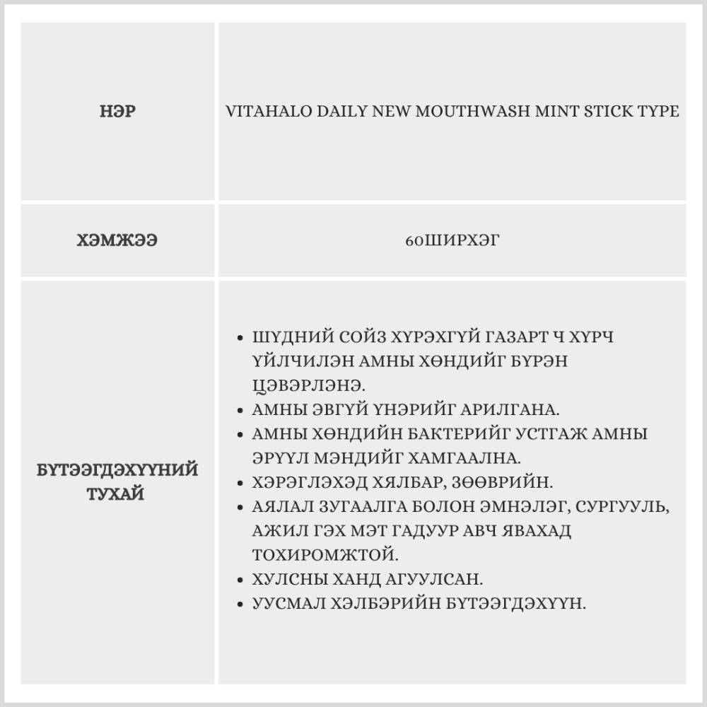 VITAHALO DAILY NEW MOUTHWASH MINT STICK TYPE /НЭГ УДААГИЙН АМ ЗАЙЛАГЧ/