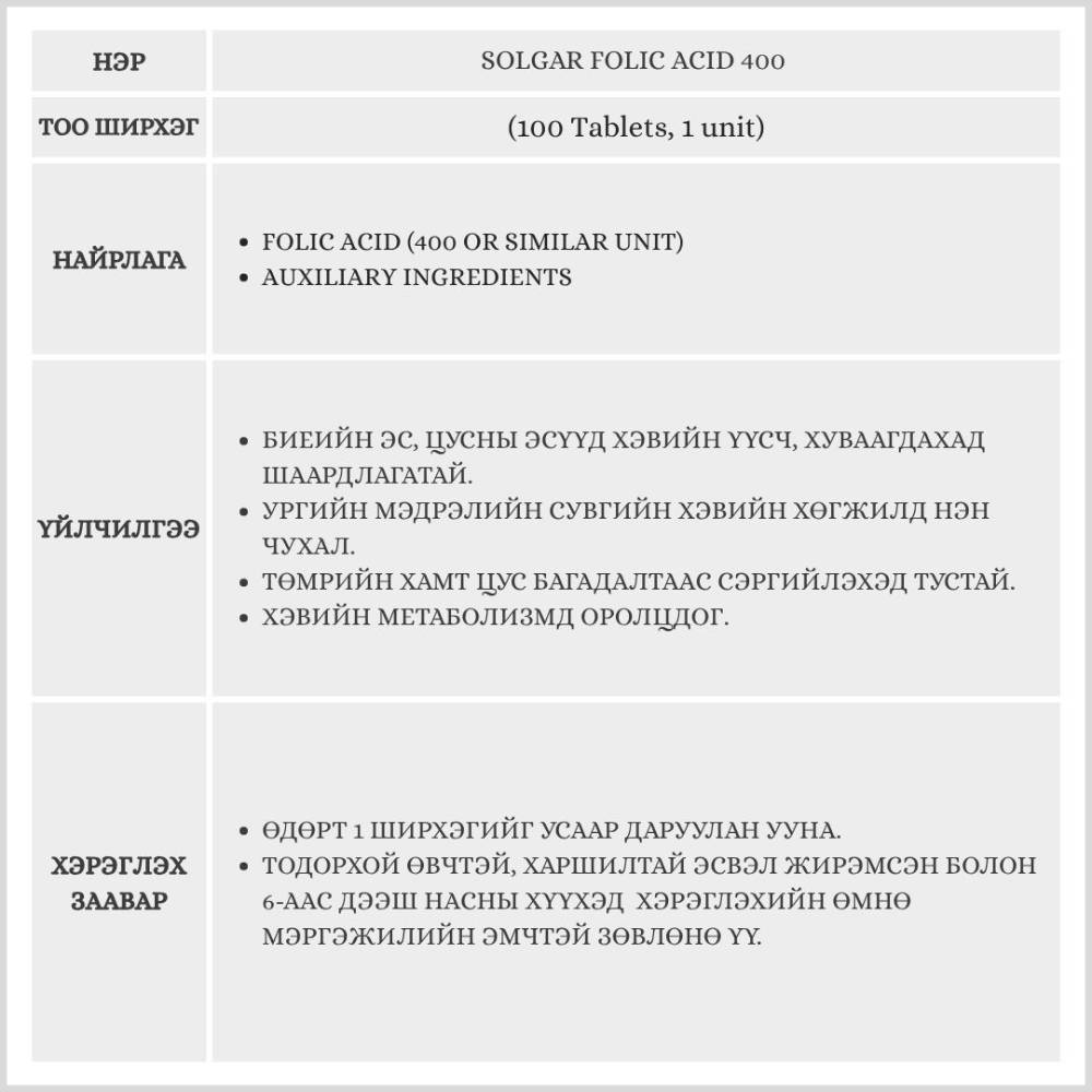 Solgar Folic Acid 400 100 Tablets, 1 unit(Төмөр / Фолийн хүчил)