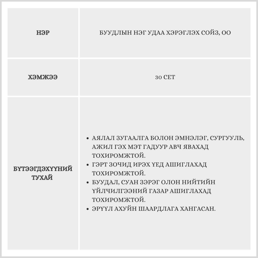 БУУДАЛ, СУАН ЗЭРЭГ ОЛОН НИЙТИЙН ҮЙЛЧИЛГЭЭНИЙ ГАЗАР АШИГЛАХАД ТОХИРОМЖТОЙ НЭГ УДААГИЙН БҮТЭЭГДЭХҮҮН.