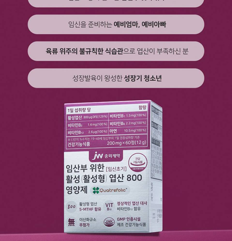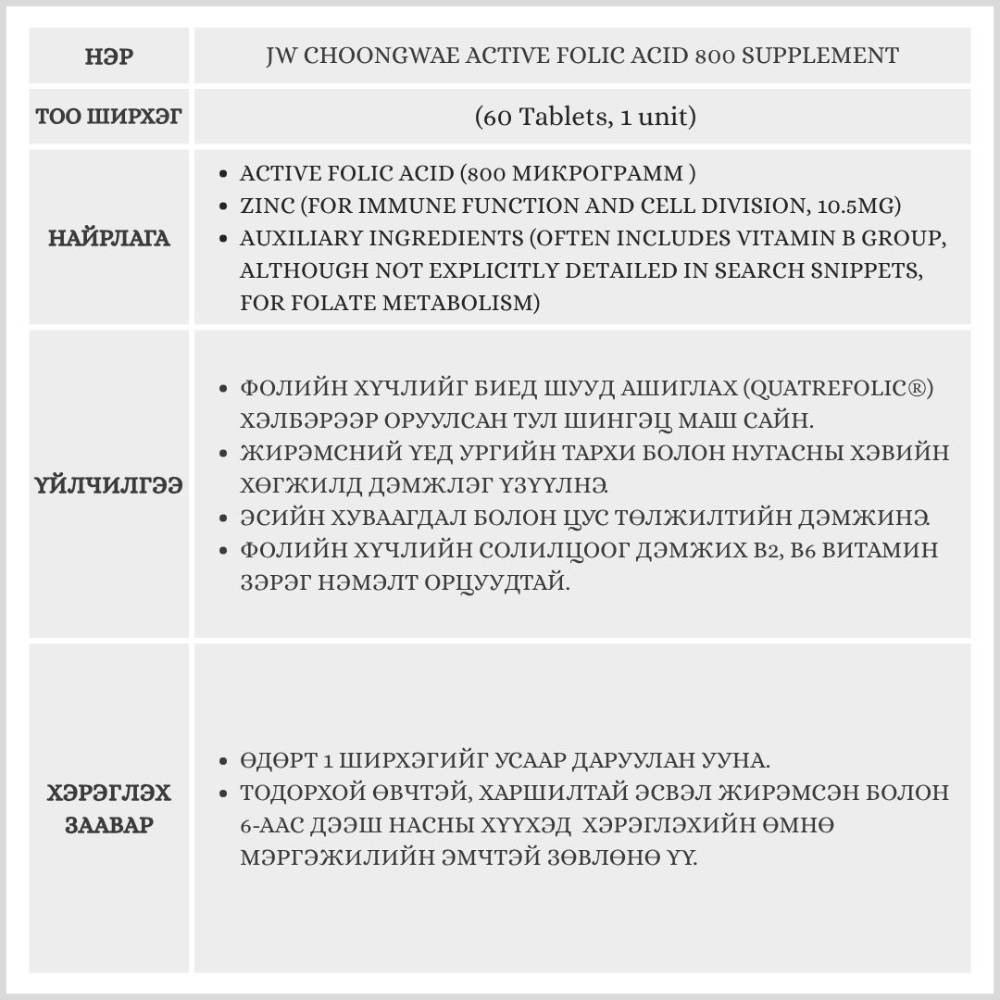 Фолийн хүчилийг (Active Folic Acid) 800 өндөр тунгаар агуулсан бүтээгдэхүүн юм. Идэвхтэй Фолийн хүчил нь биед шууд шингэж, эсийн хуваагдал, цус төлжилт болон ургийн хэвийн хөгжилд дэмжлэг үзүүлнэ.