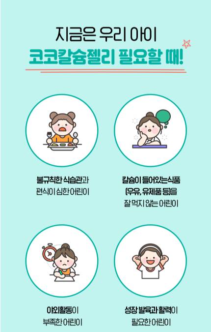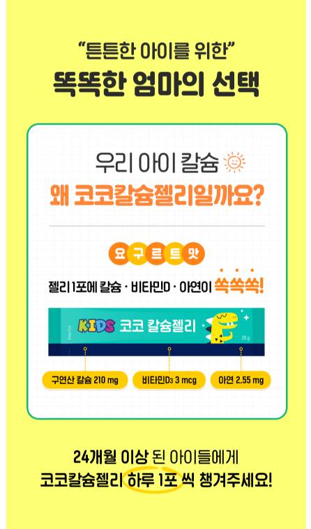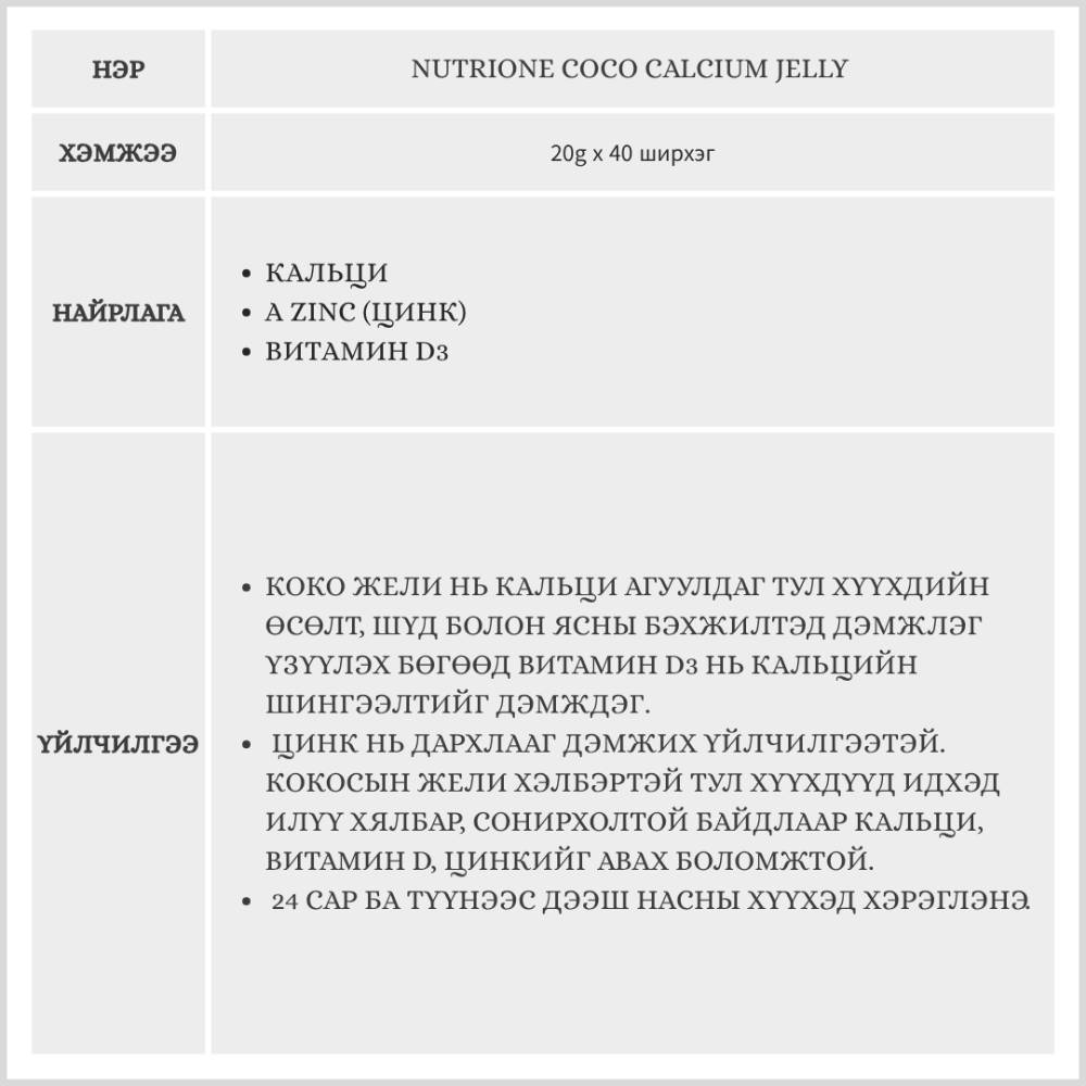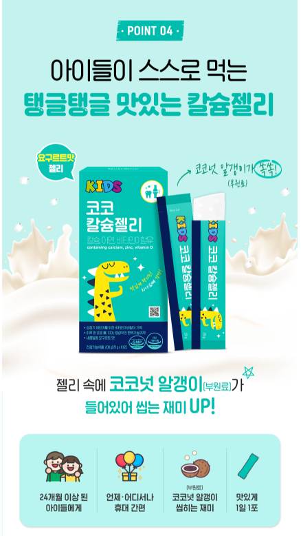 Коко жели нь кальци агуулдаг тул хүүхдийн өсөлт, шүд болон ясны бэхжилтэд дэмжлэг үзүүлэх бөгөөд Витамин D3 нь кальцийн шингээлтийг дэмждэг. Цинк нь дархлааг дэмжих үйлчилгээтэй. Кокосын жели хэлбэртэй тул хүүхдүүд идхэд илүү хялбар, сонирхолтой байдлаар кальци, витамин D, цинкийг авах боломжтой.