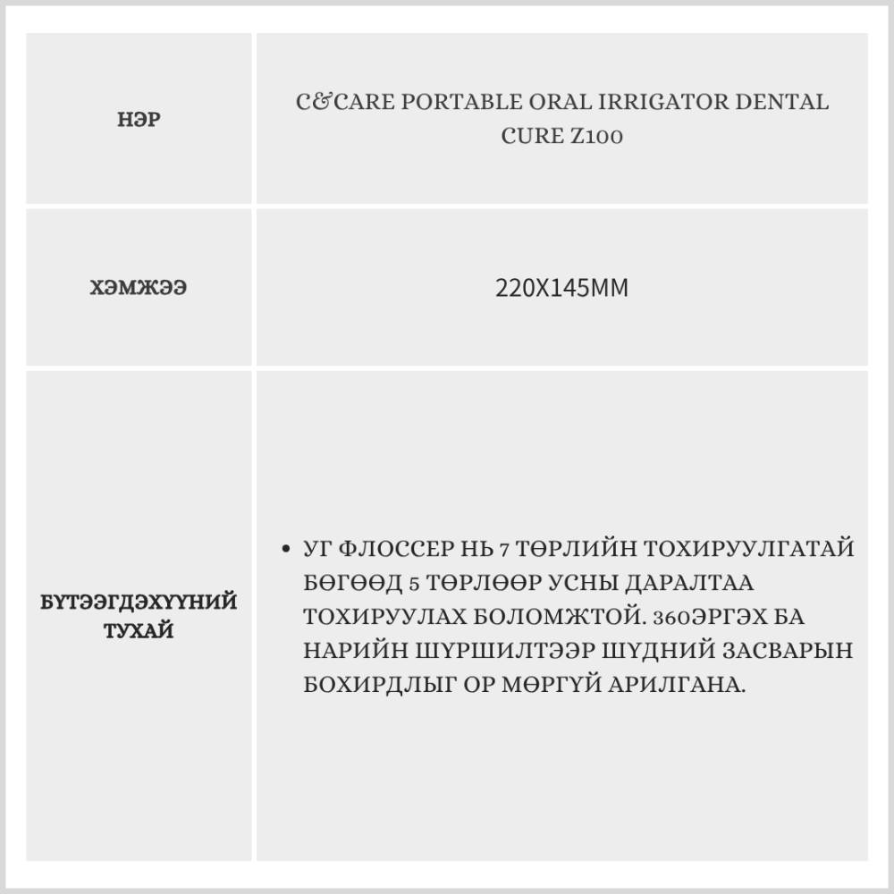 Уг флоссер нь шүдний завсар үлдсэн үлдэгдлийг 99.9% цэвэрлэх ба шүд хорхойдолт болон цоорлоос сэргийлнэ. 0.6мм нарийн шүршилтээр шүршинэ. 360эргэх ба том усны савтай. Усны хамгаалалттай.