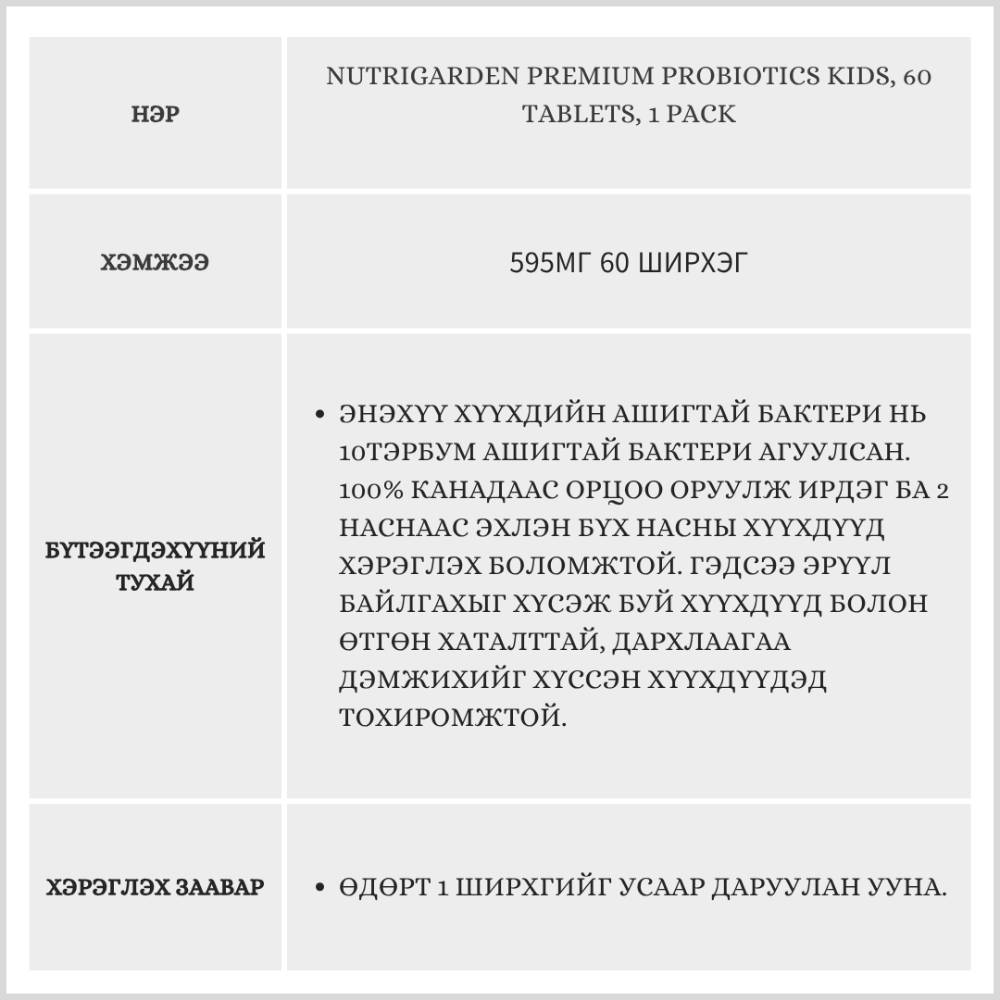 NutriGarden Premium Probiotics Kids, 60 tablets, 1 pack /Хүүхдийн ашигтай бактери/