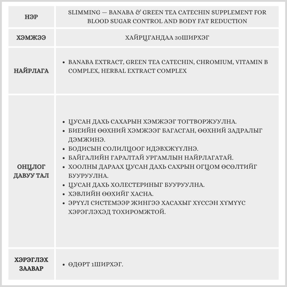 BANABA & GREEN TEA CATECHIN SUPPLEMENT FOR BLOOD SUGAR CONTROL AND BODY FAT REDUCTION/ ЖИН ХАСАХ ТУРААХ БҮТЭЭГДЭХҮҮН /