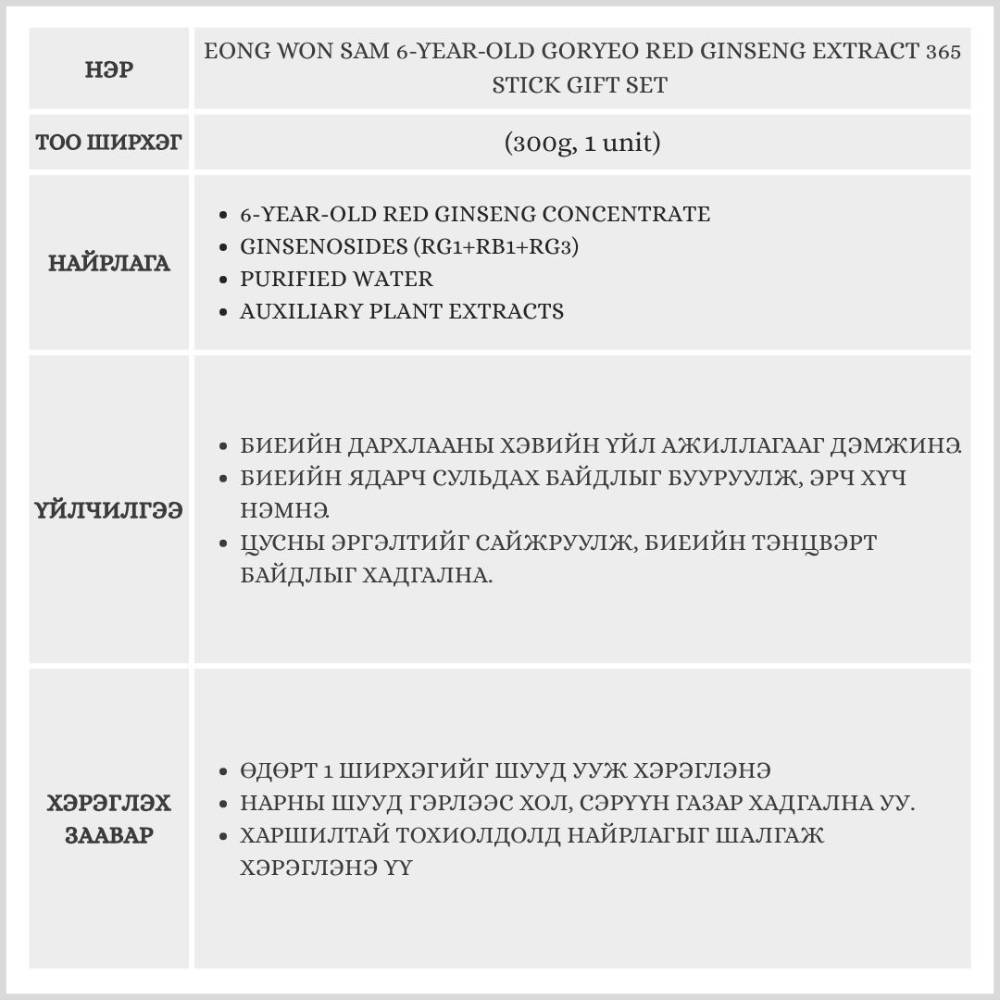 Jeong Won Sam 6-Year-Old Goryeo Red Ginseng Extract 365 Stick Gift Set 300g, 1 unit(Хүн орхоодой)