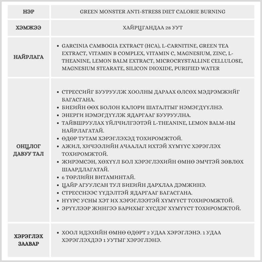 GREEN MONSTER ANTI-STRESS DIET CALORIE BURNING/ ЖИН ХАСАХ ТУРААХ БҮТЭЭГДЭХҮҮН /