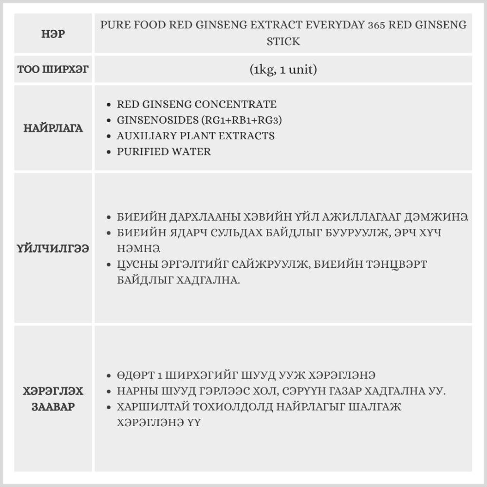 Pure Food Red Ginseng Extract Everyday 365 Red Ginseng Stick 1kg, 1 unit(Хүн орхоодой)