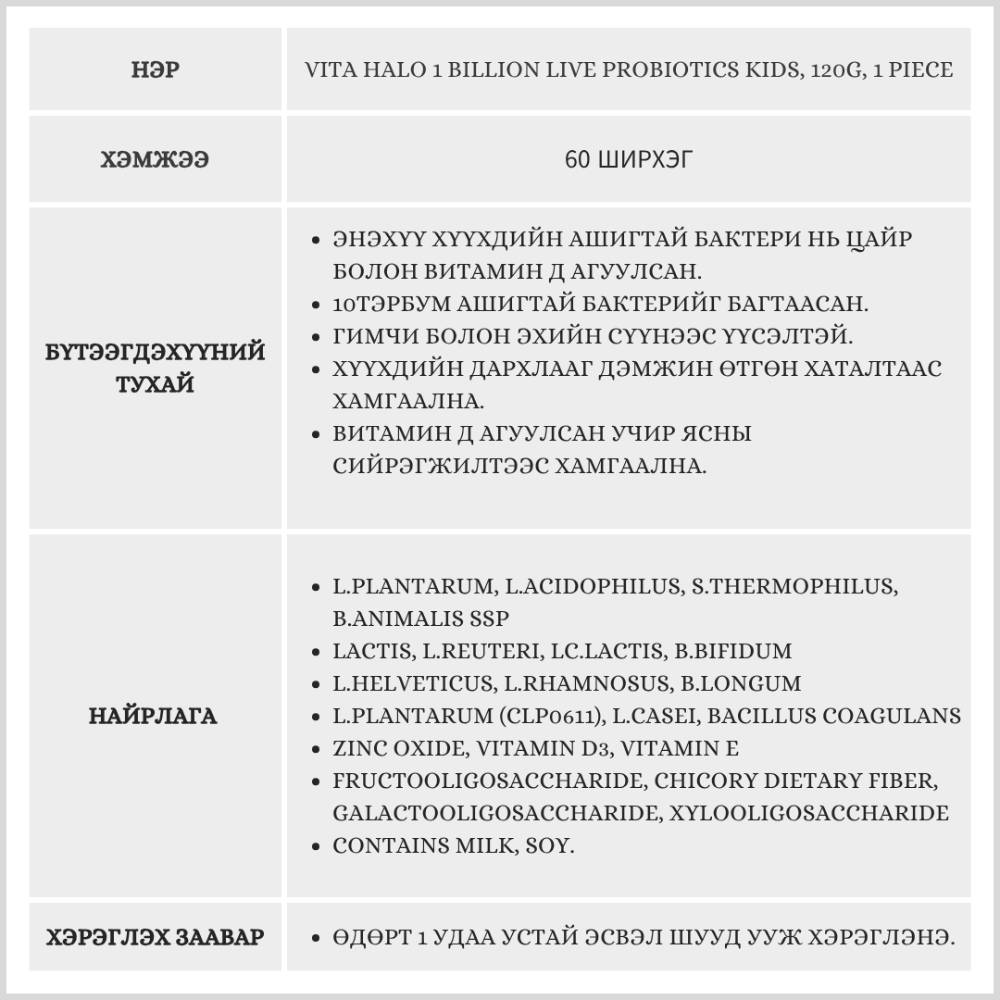 Vita Halo 1 Billion Live Probiotics Kids, 120g, 1 piece /Хүүхдийн ашигтай бактери/