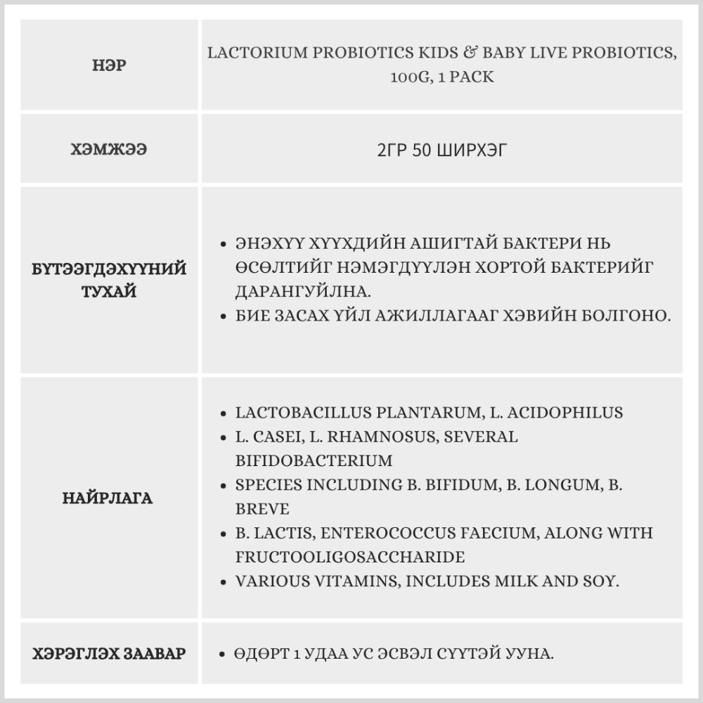 Lactorium Probiotics Kids & Baby Live Probiotics, 100g, 1 pack /Хүүхдийн ашигтай бактери/
