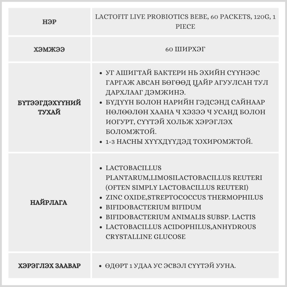Уг ашигтай бактери нь 60ширхэгтэй 2 сарын хэрэглээг агуулсан. Нэмэлт цайр агуулсан тул хүүхдийн дархлааг дэмжинэ. 1-3 насны хүүхдүүд хэрэглэхэд тохиромжтой.