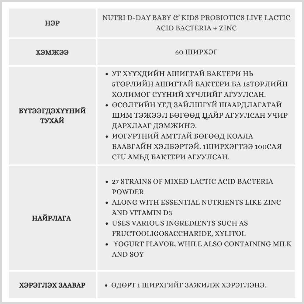 Nutri D-Day Baby & Kids Probiotics Live Lactic Acid Bacteria + Zinc /Хүүхдийн ашигтай бактери/