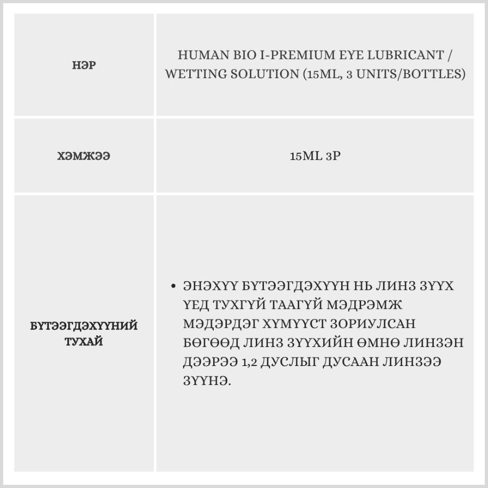 Human Bio i-Premium Eye Lubricant / Wetting Solution (15ml, 3 units/bottles) /Линзний дусаалга /