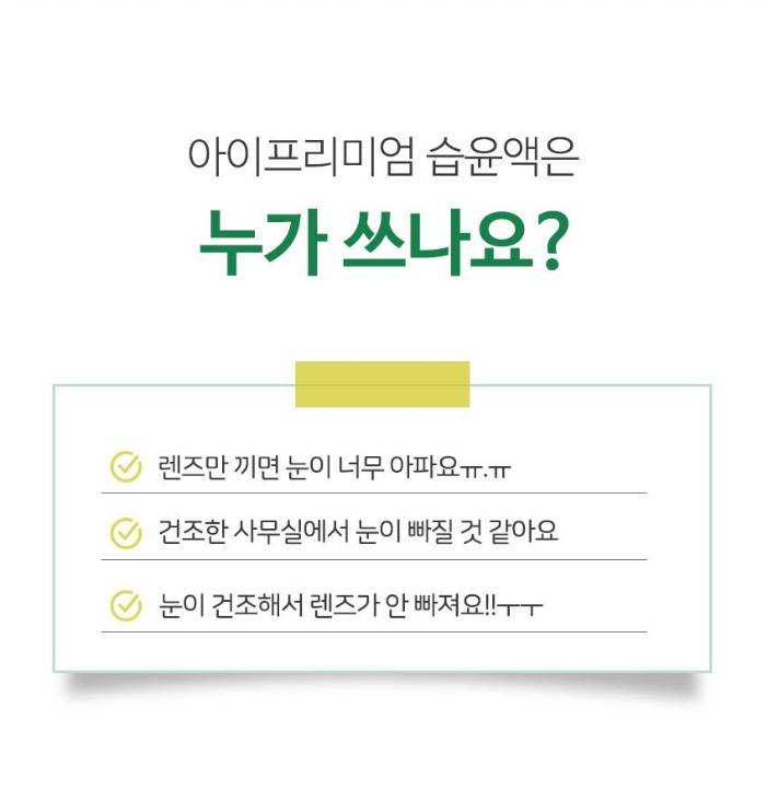 Энэхүү бүтээгдэхүүн нь линз зүүх үед тухгүй мэдрэмж авдаг хүмүүст зориулсан линзний дусаалга. Нүд нь хуурайшдаг болон линз зүүх үед өвддөг, хуурайшин линз авагддаггүй хүмүүст зориулсан.
