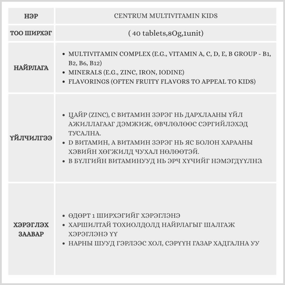 Centrum Multivitamin Kids 40 tablets,8Og,1unit (Хүүхдийн нэмэлт тэжээл)