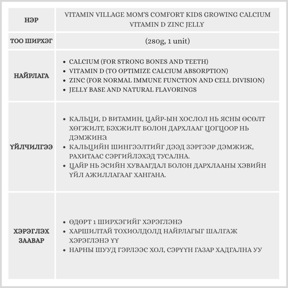 Vitamin Village Mom's Comfort Kids Growing Calcium Vitamin D Zinc Jelly 280g, 1 unit (Хүүхдийн нэмэлт тэжээл)