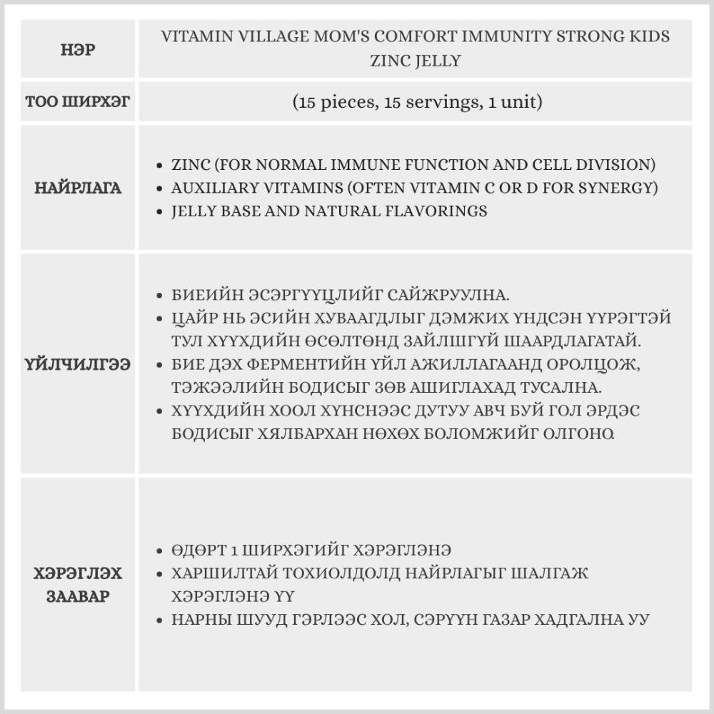 Vitamin Village Mom's Comfort Immunity Strong Kids Zinc Jelly 15 p, 15 servings, 1 unit (Хүүхдийн нэмэлт тэжээл)